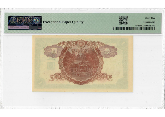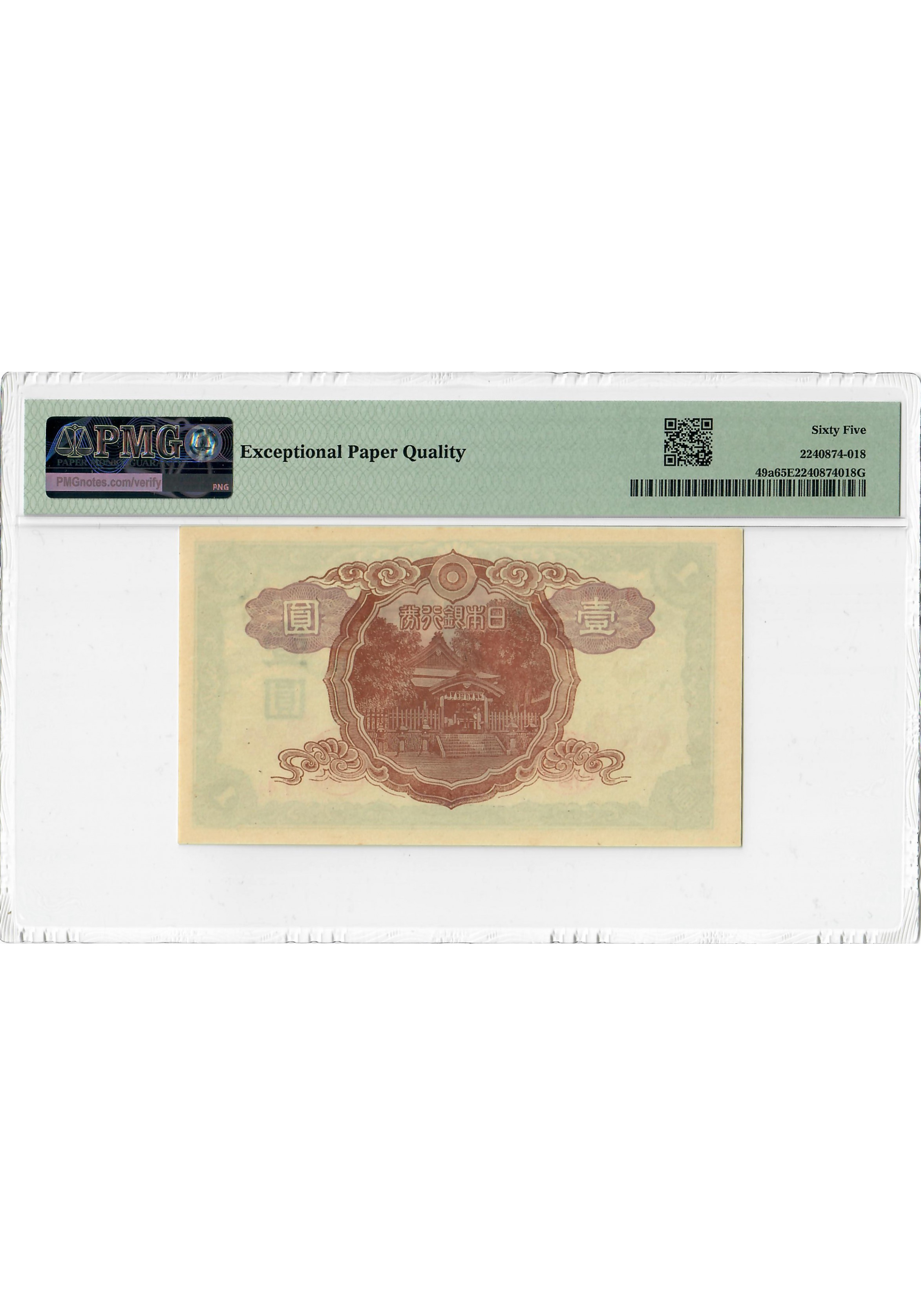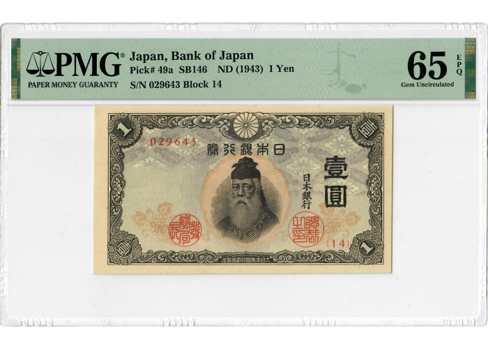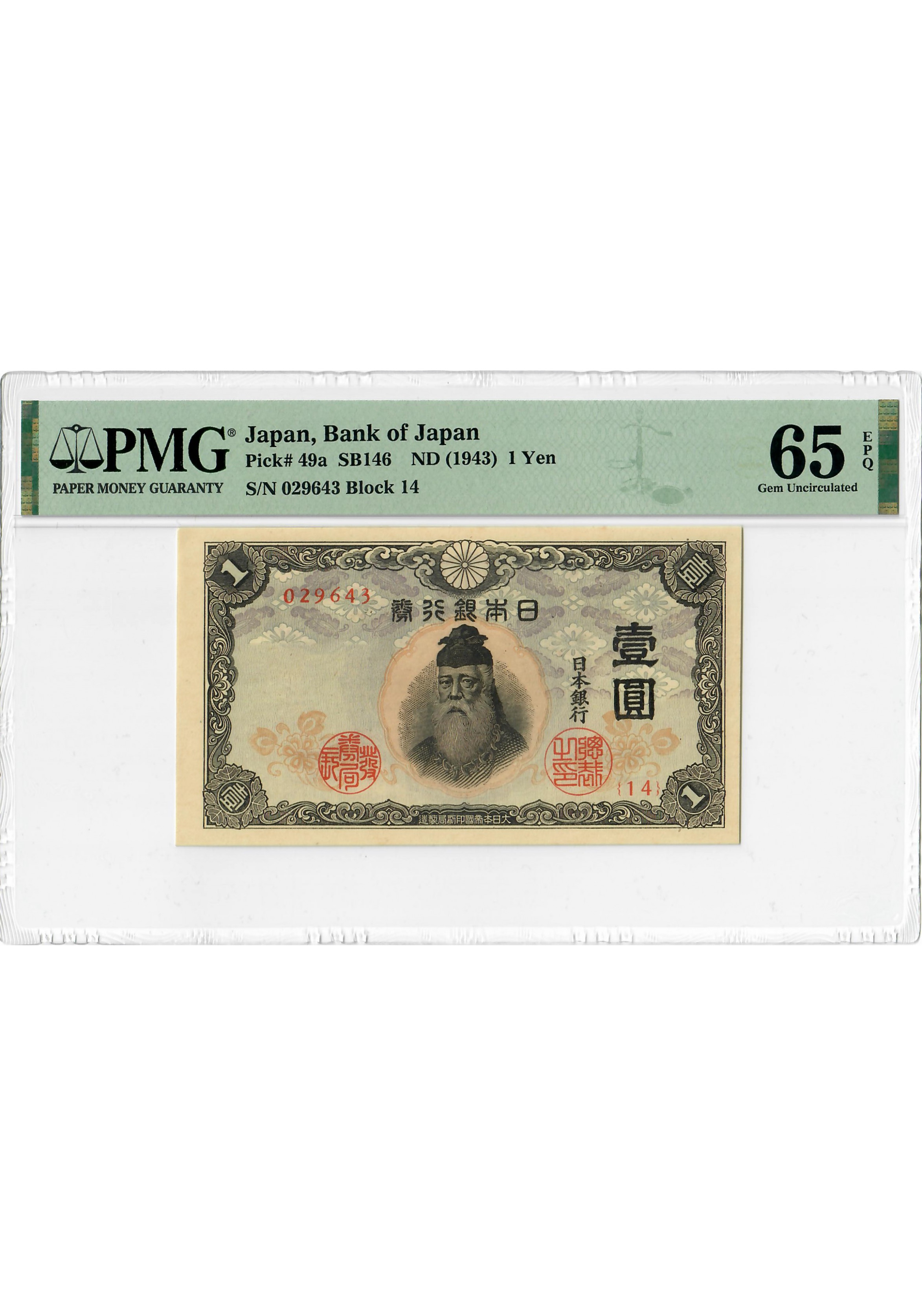 Japan 1 Yen 1943, PMG 65 EPQ, "Bank of Japan" Pick# 49a