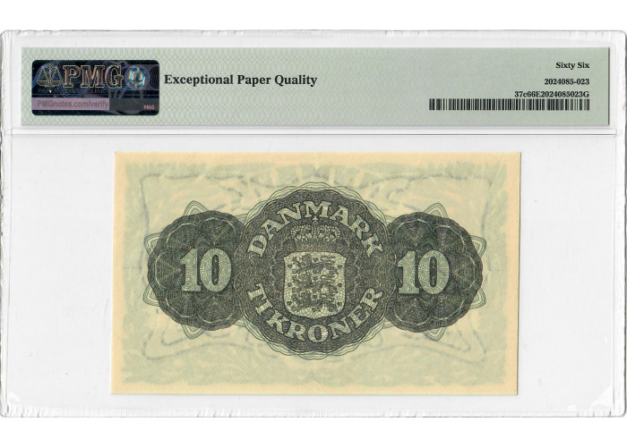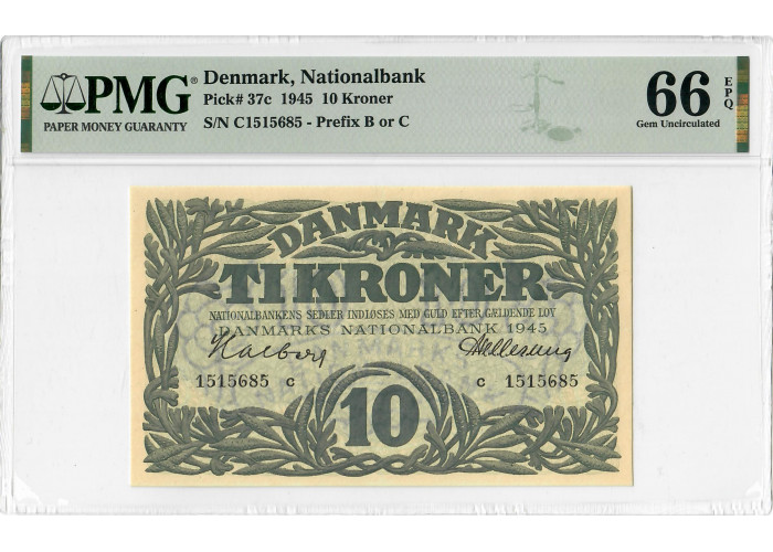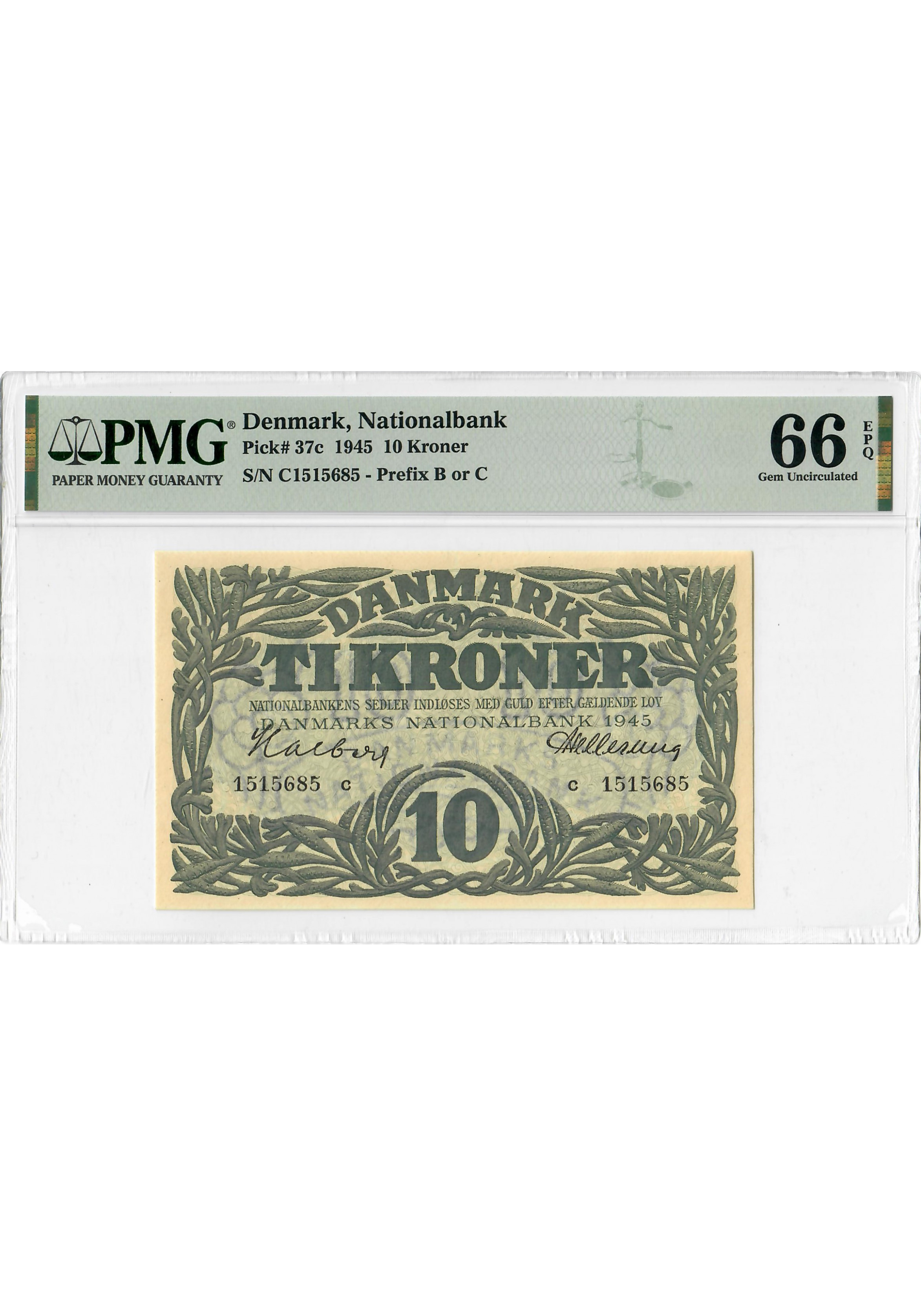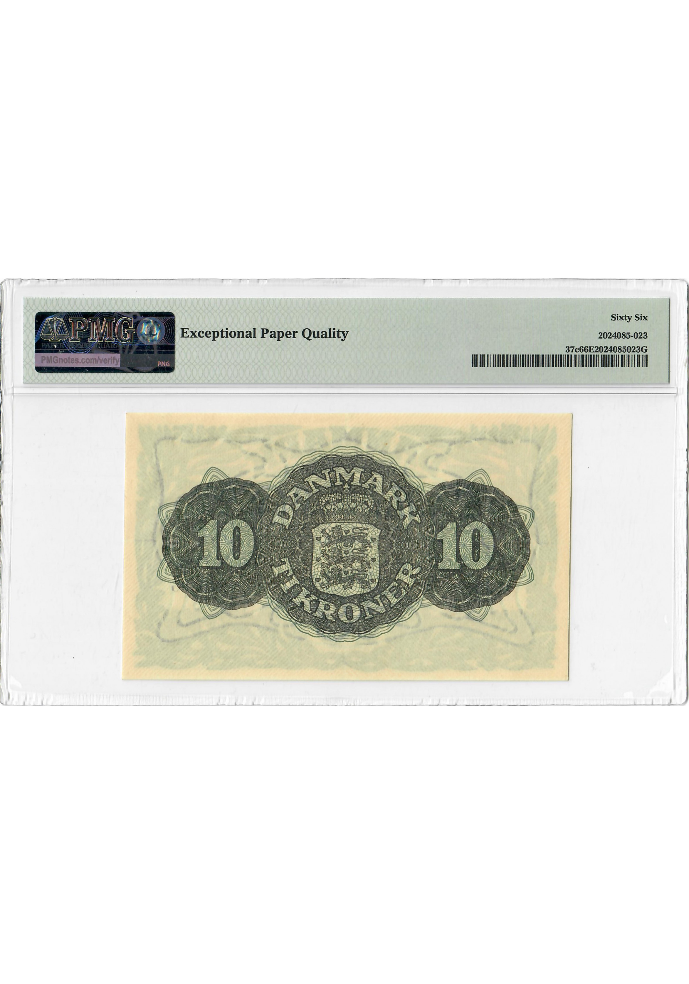 Denmark 10 Kroner 1945, PMG 66 EPQ, "Nationalbank" Pick# 37c