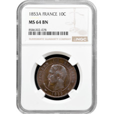 France 10 centimes 1853 A, NGC MS64 BN, "Emperor Napoleon III (1852 - 1870)"