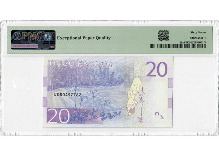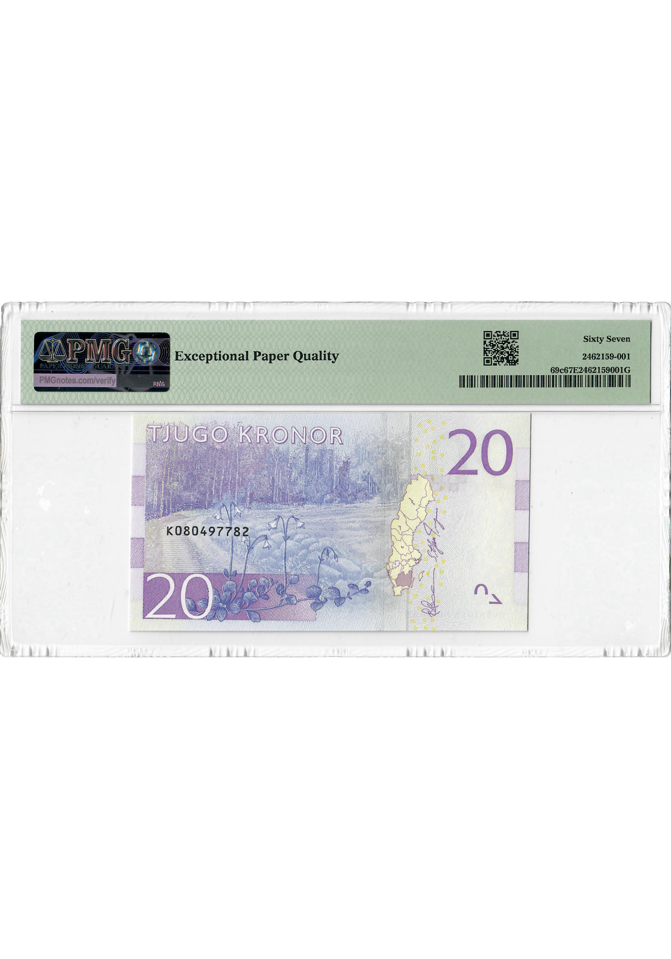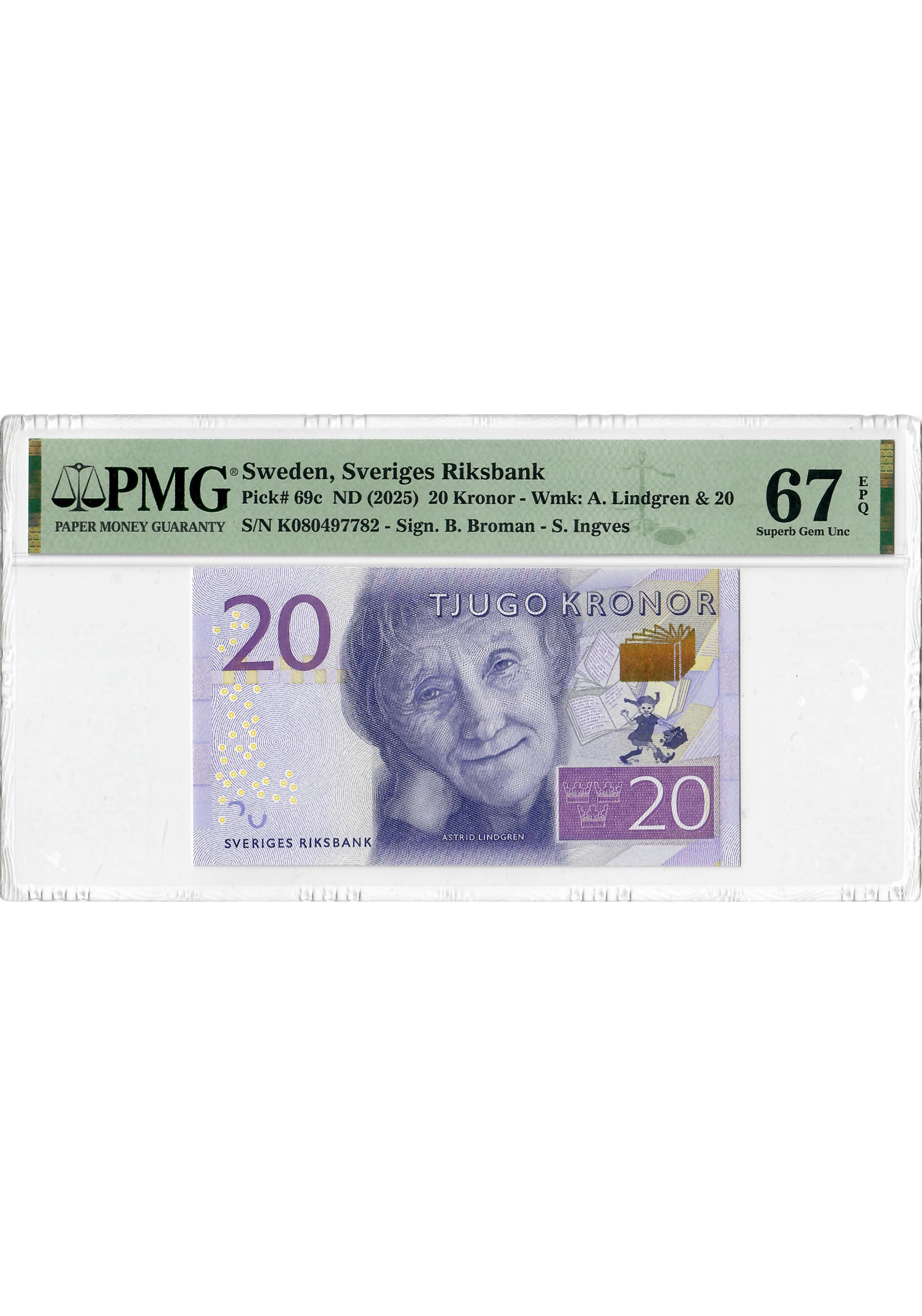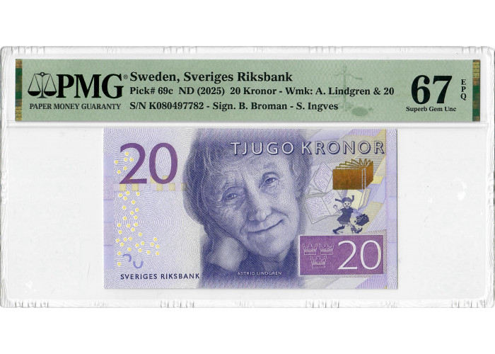 Sweden 20 Kronor ND (2025), PMG 67 EPQ, "Sveriges Riksbank" Pick# 69c
