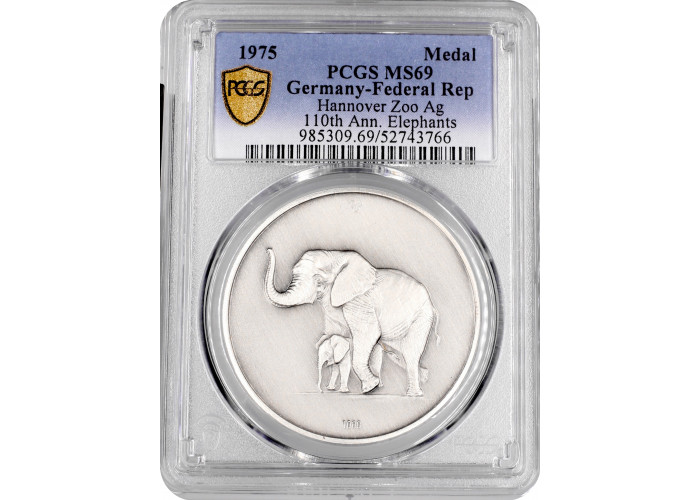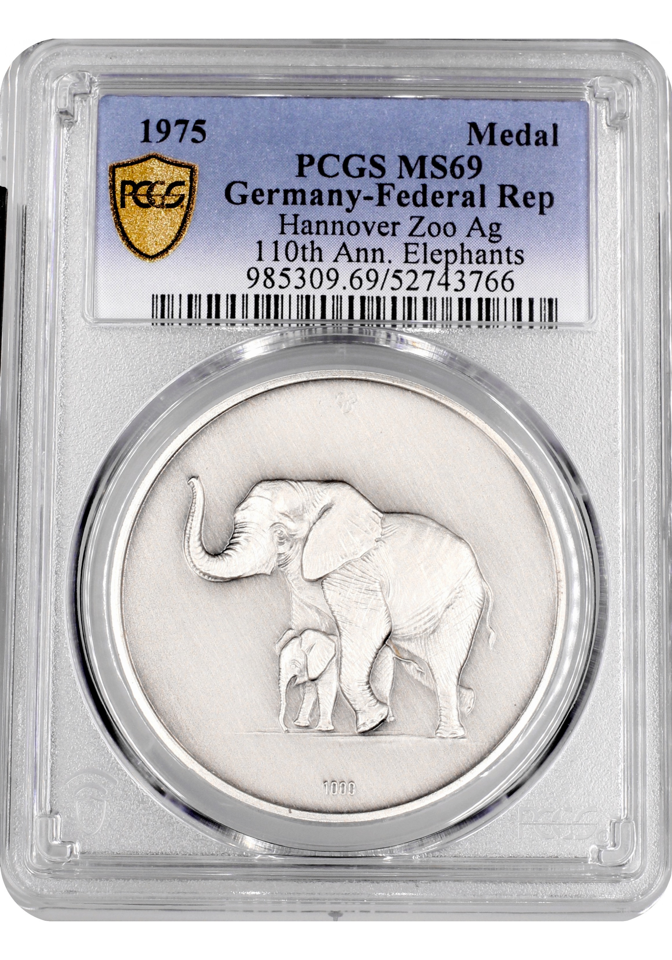 Germany - FRG silver medal 1975, PCGS MS69, "110th Ann. Hannover Zoo - Elephant"