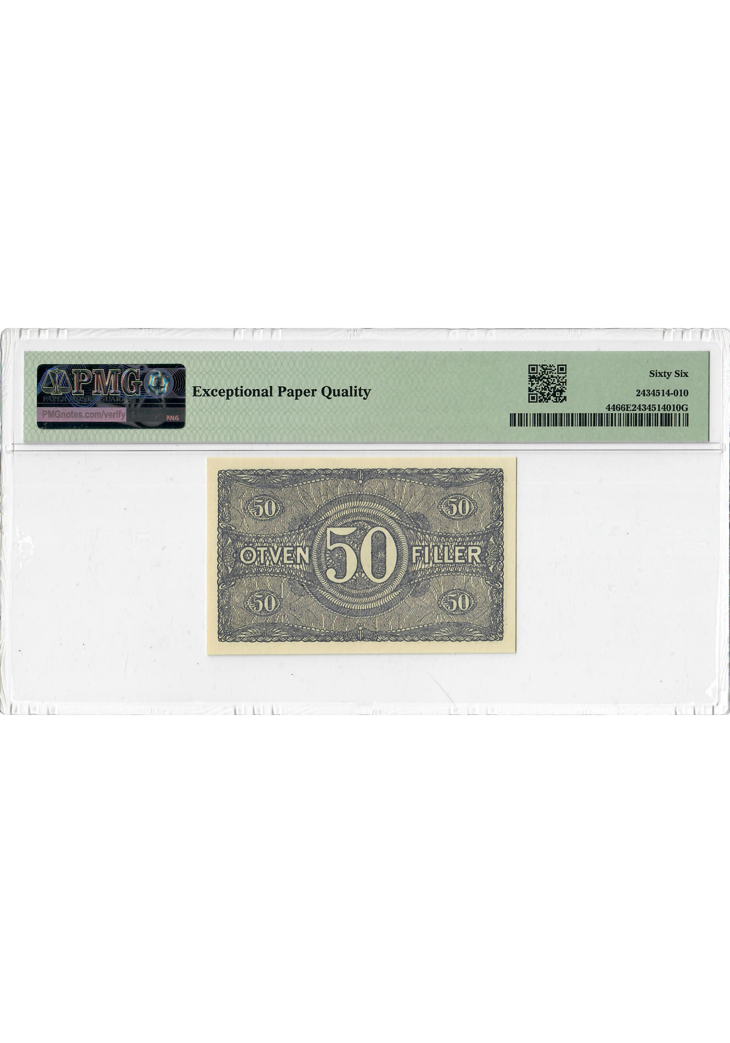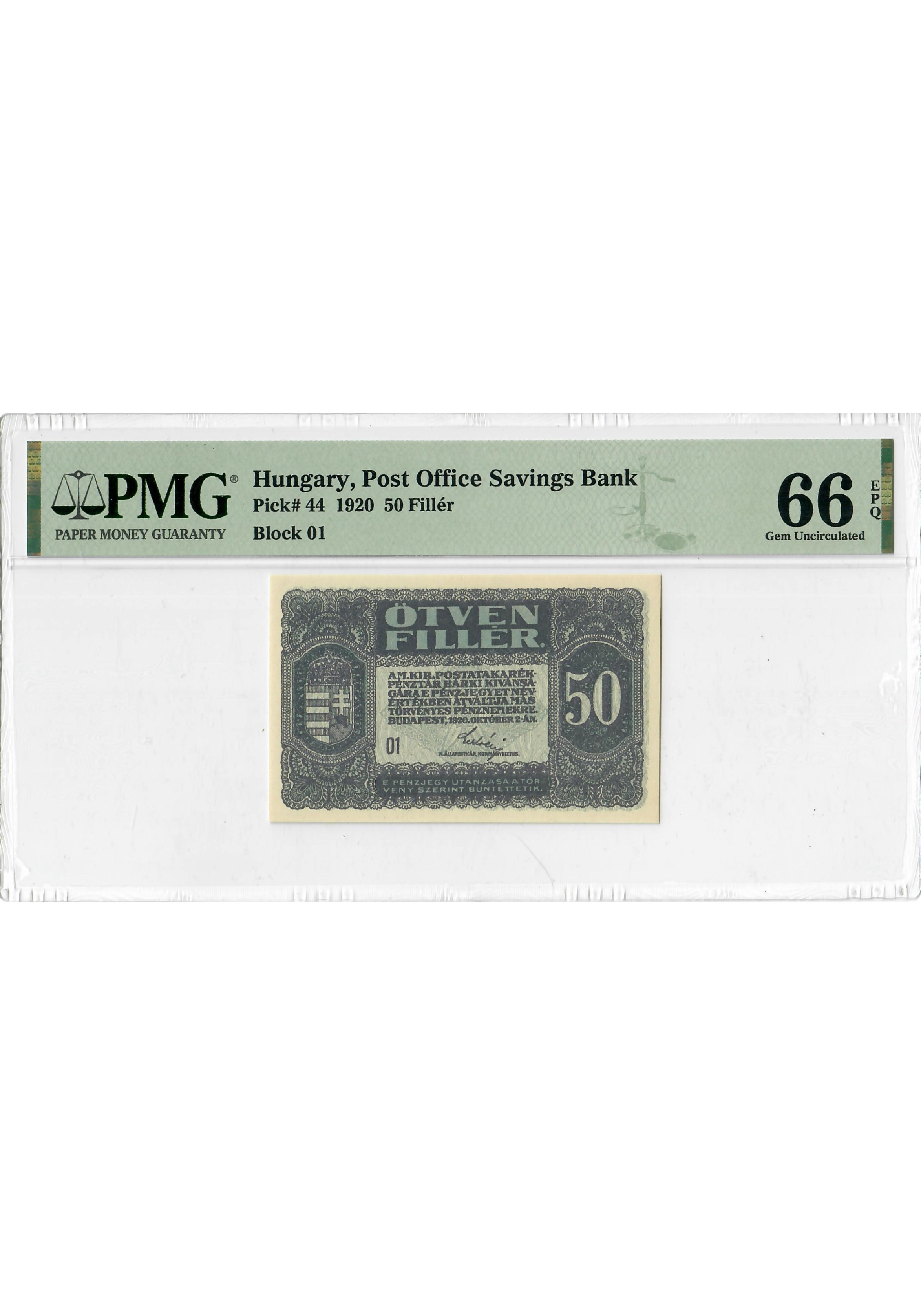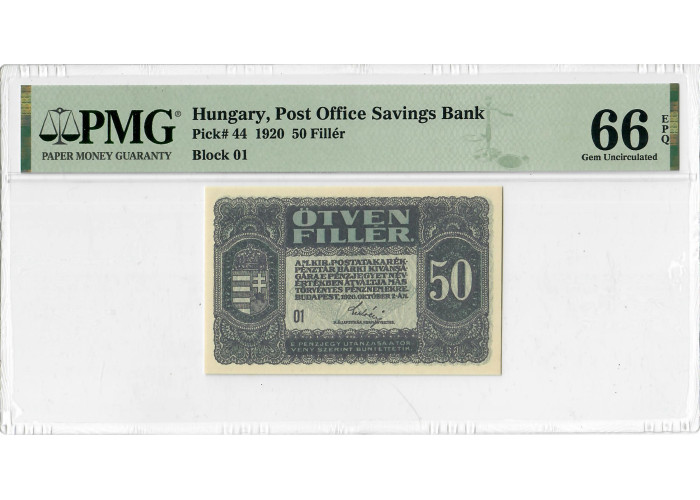 Hungary 50 Filler 1920, PMG 66 EPQ, "Post Office Savings Bank" Pick# 44 Top Pop