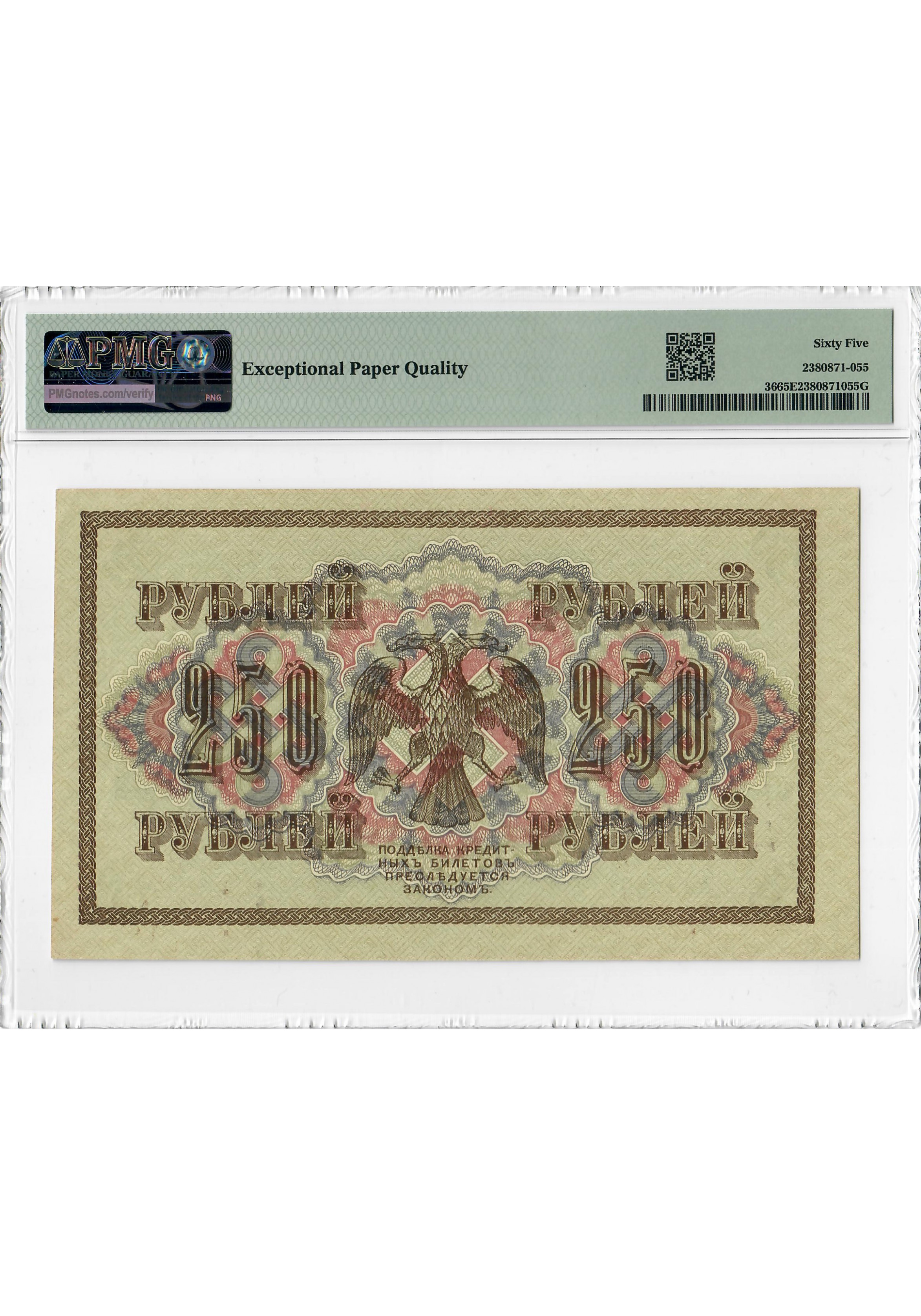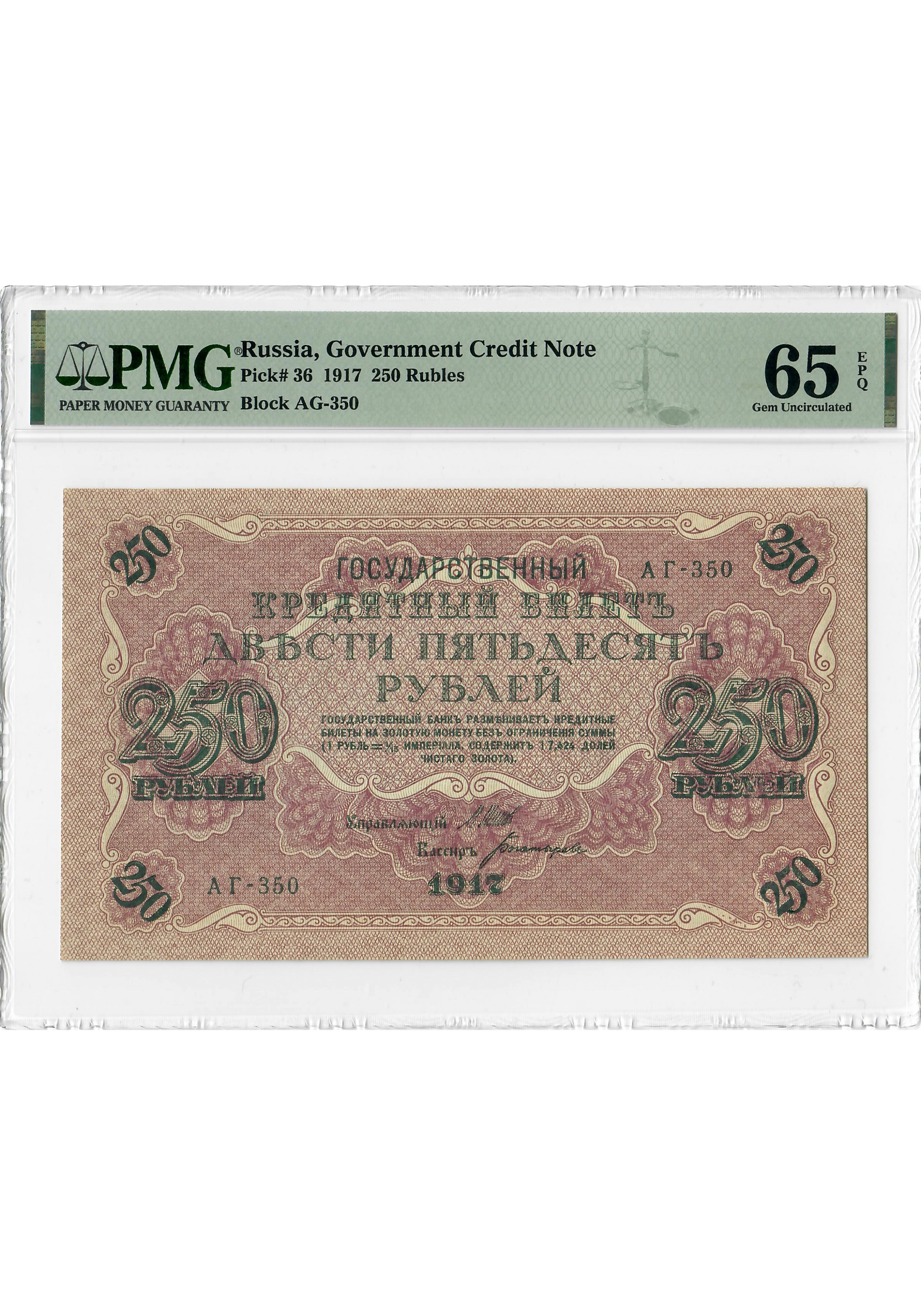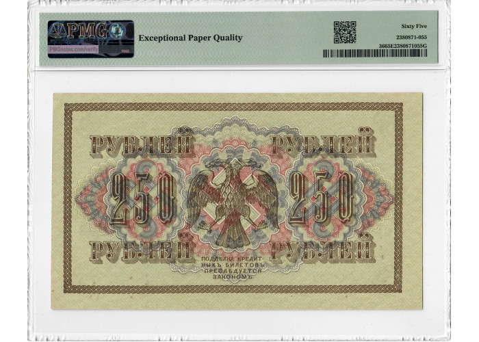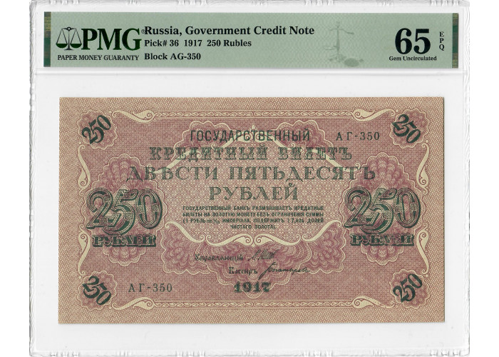 Russia 250 Rubles 1917, PMG 65 EPQ, "Government Credit Note" Pick# 36