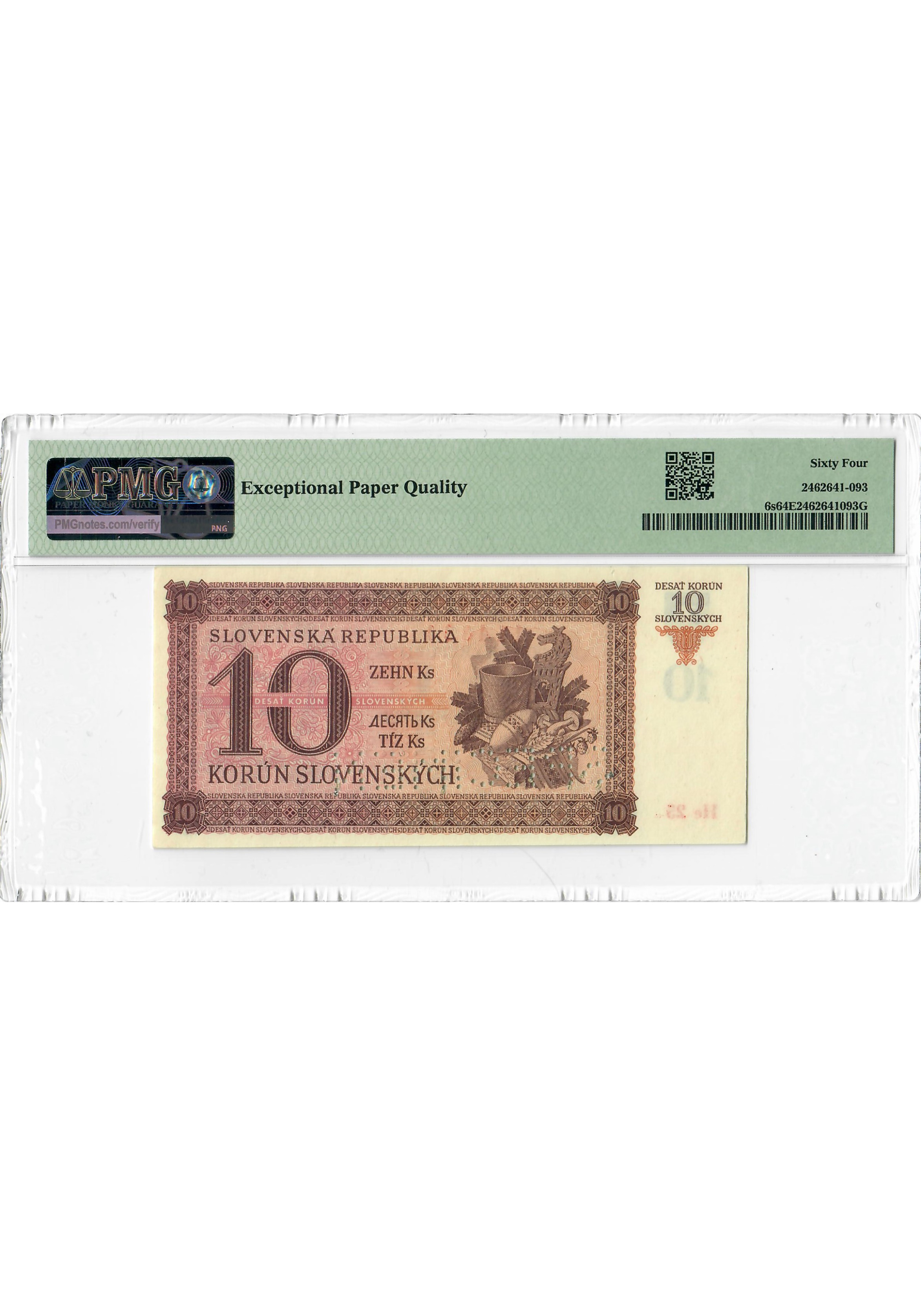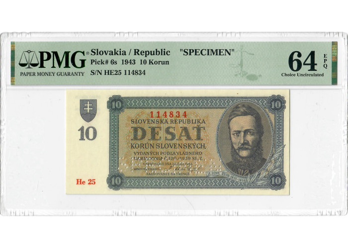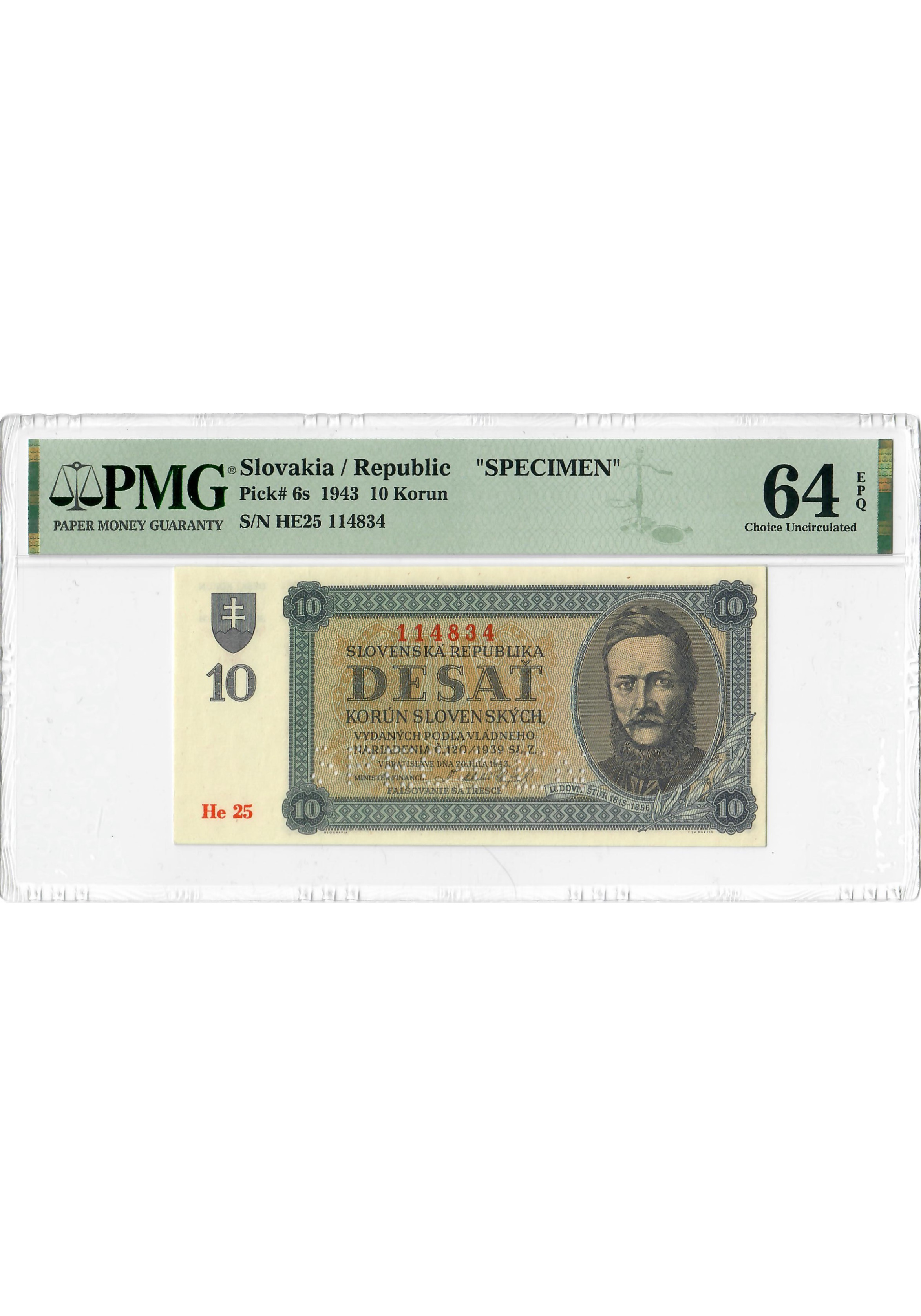 Slovakia 10 Korun 1943, PMG 64 EPQ SPECIMEN, "National Bank" Pick# 6s