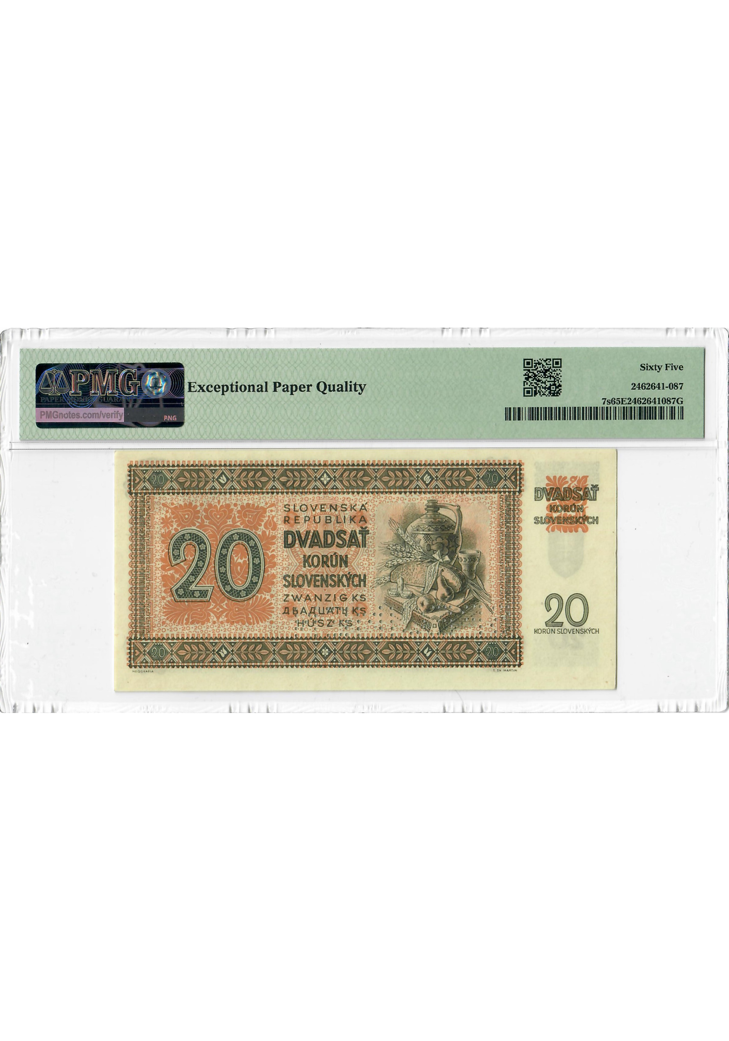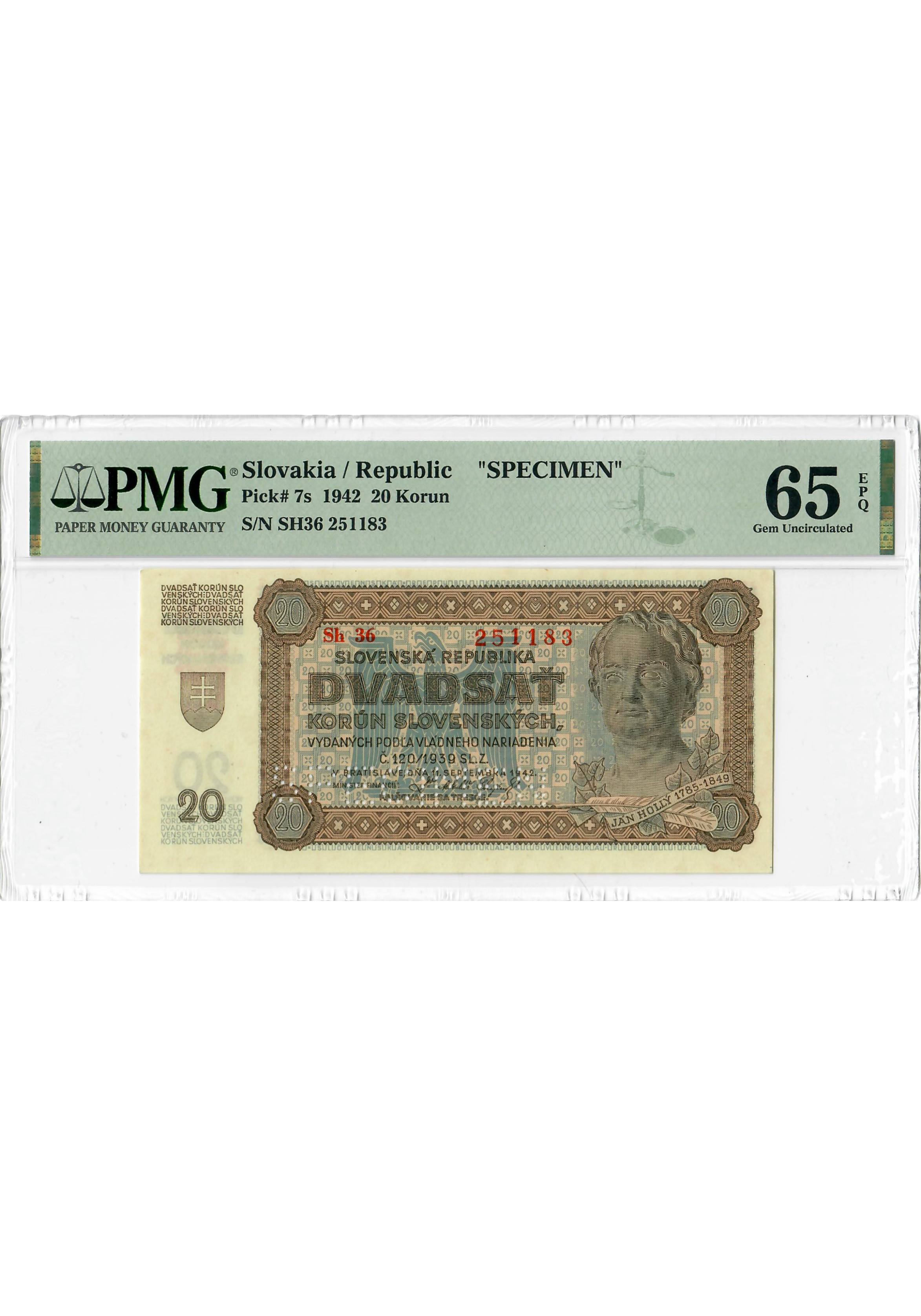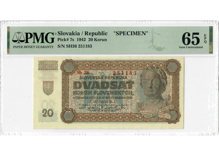 Slovakia 20 Korun 1942, PMG 65 EPQ SPECIMEN, "National Bank" Pick# 7s