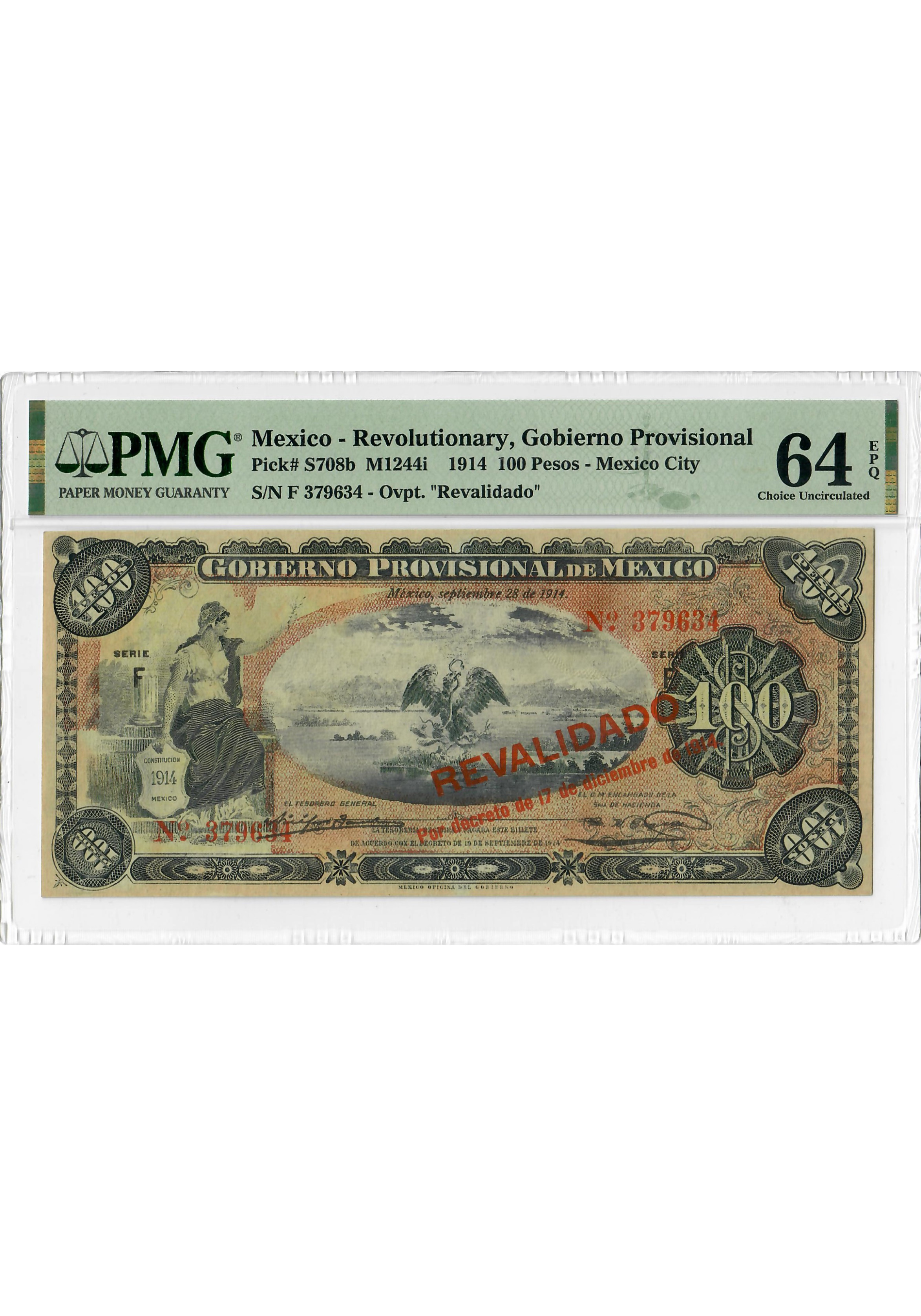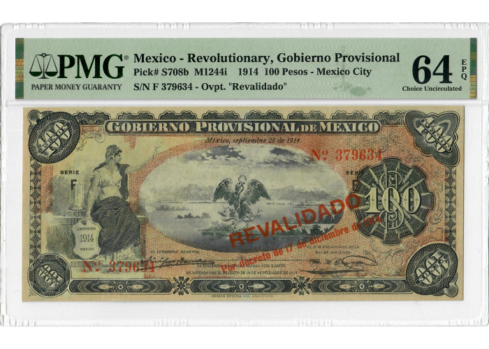 Mexico 100 Pesos 1914, PMG 64 EPQ, "Revolutionary Gobierno Provisional" P# S708b