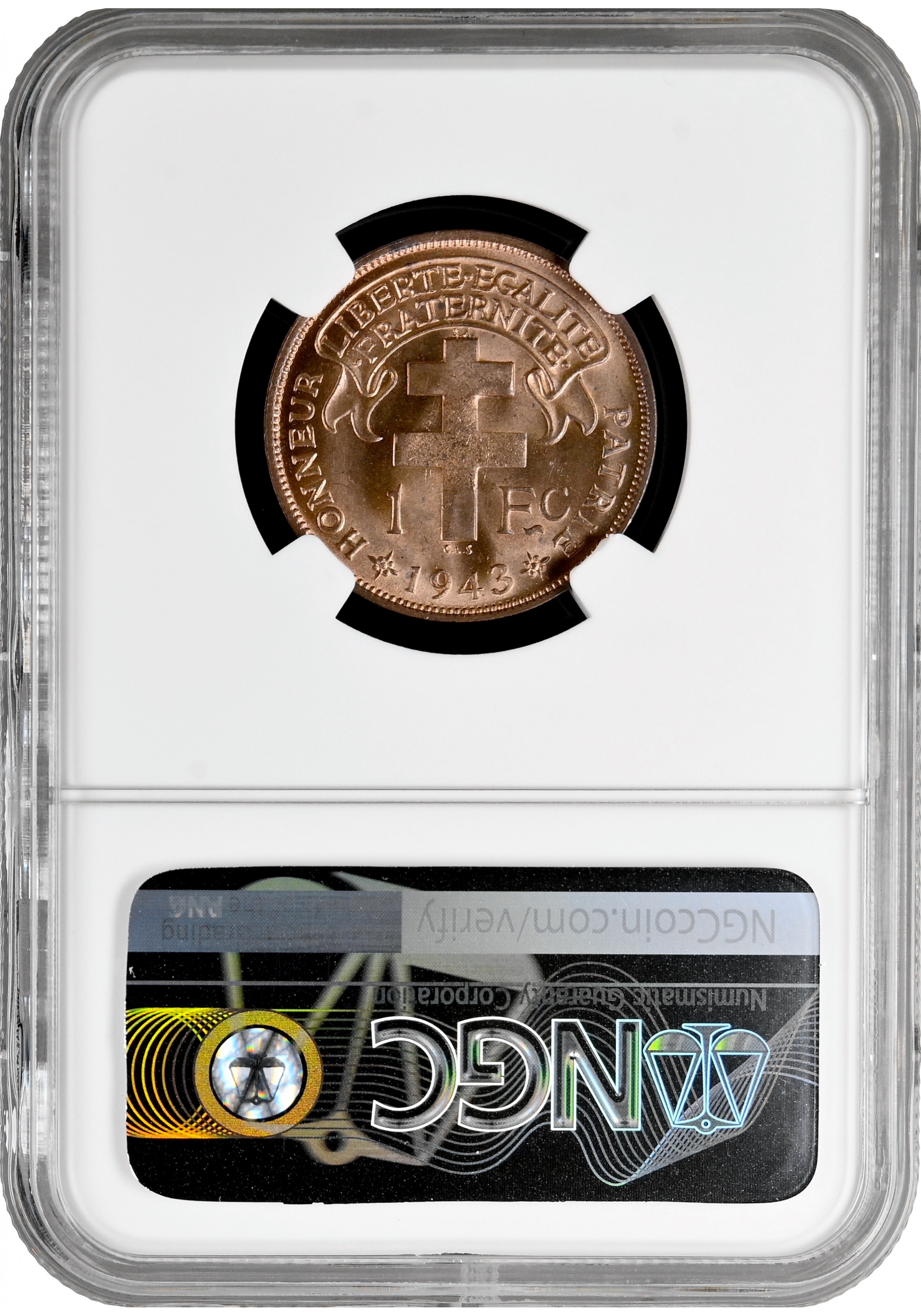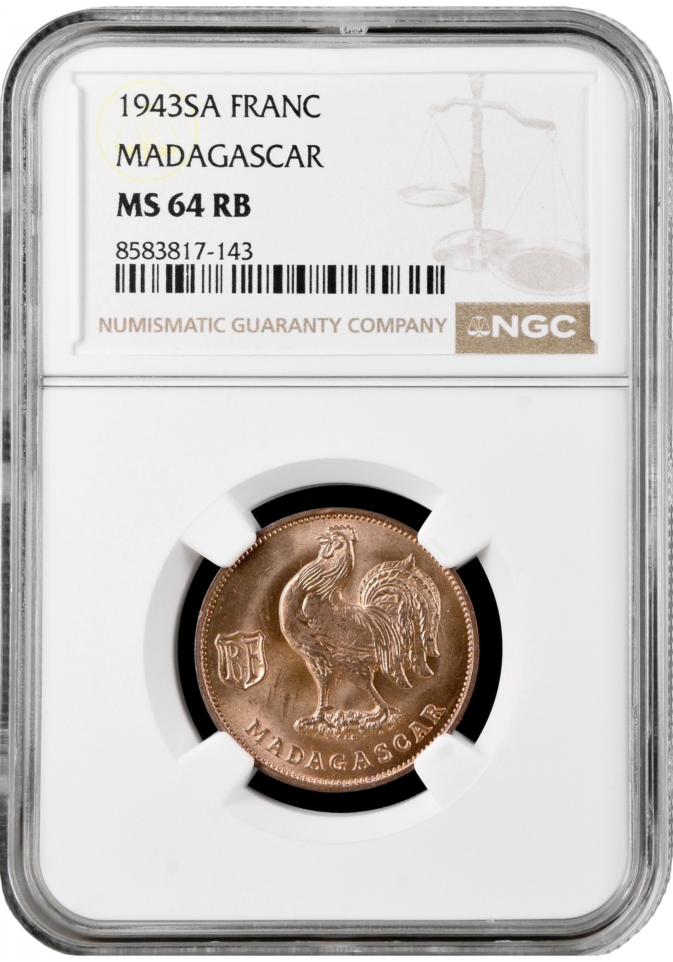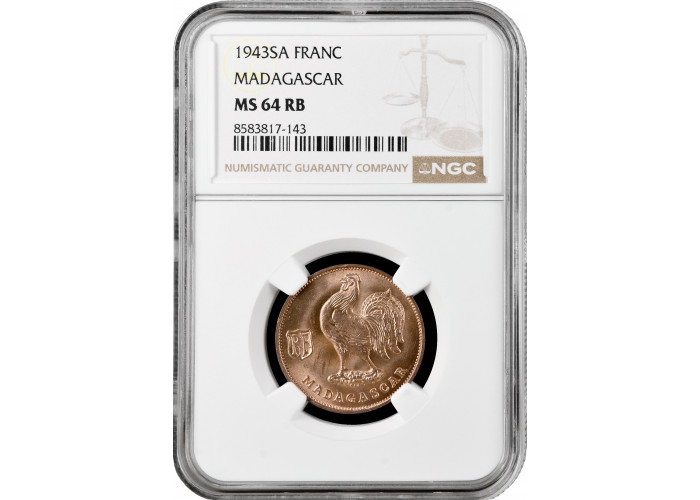 Мадагаскар 1 франк 1943 г. SA, NGC MS64 RB, "Заморская территория Франции (1943 - 1958)"