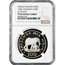 Танзания 100 шиллингов 1986 г., NGC PF69 UC, "Всемирный фонд дикой природы - Слон"