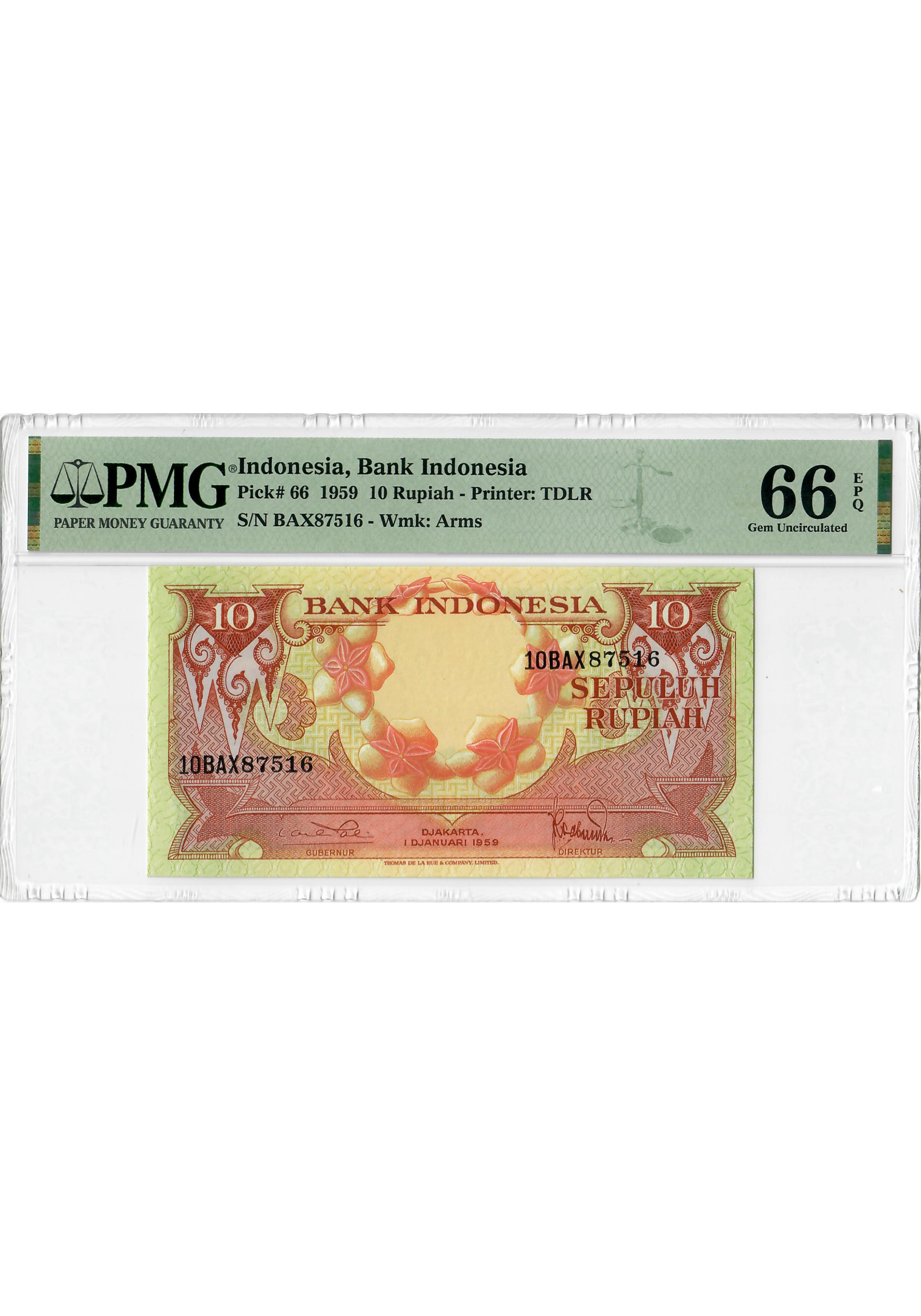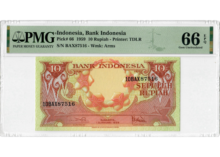 Індонезія 10 рупій 1959, PMG 66 EPQ, "Bank Indonesia" Pick# 66