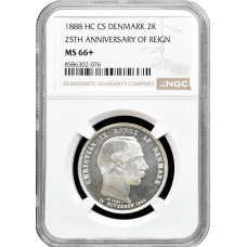 Дания 2 кроны 1888 г. HC CS, NGC MS66+, "25 лет правления"