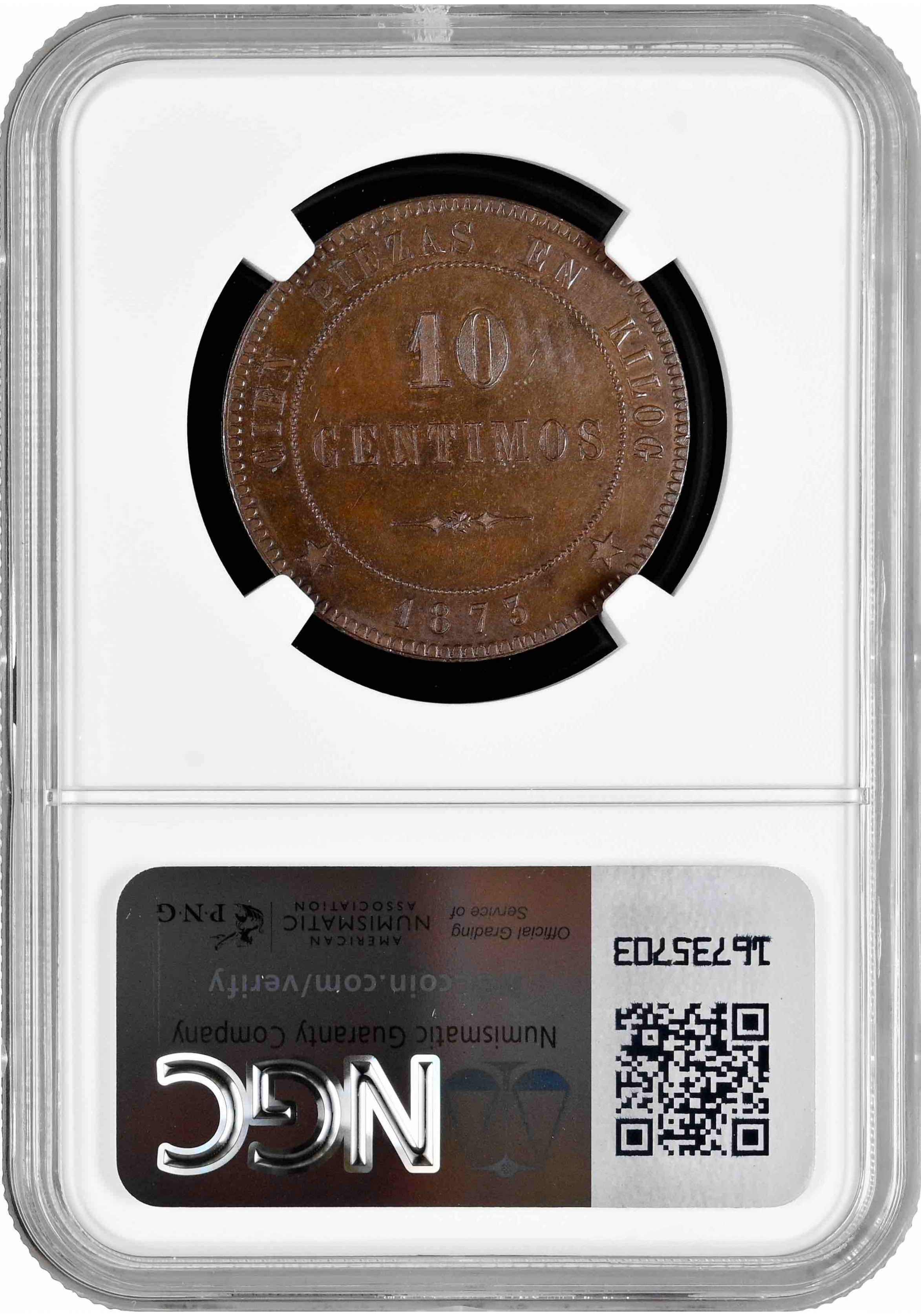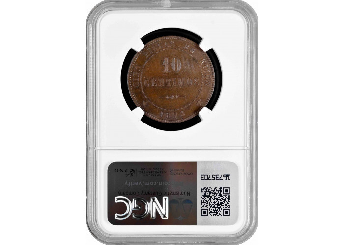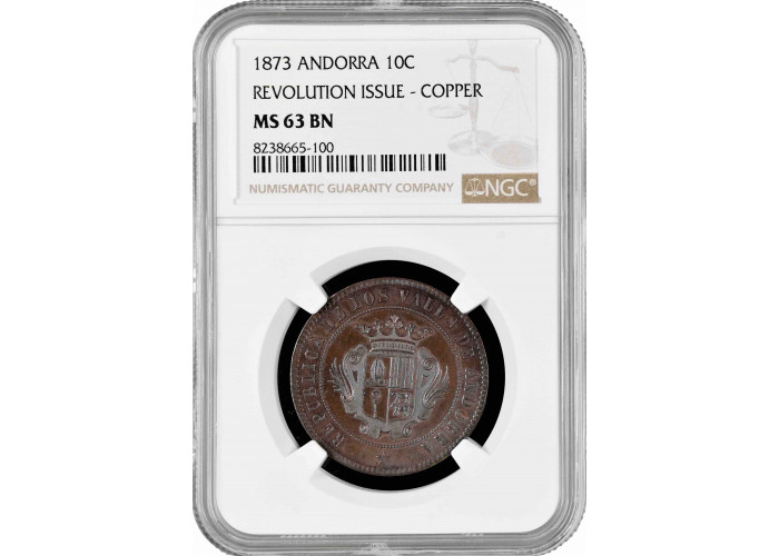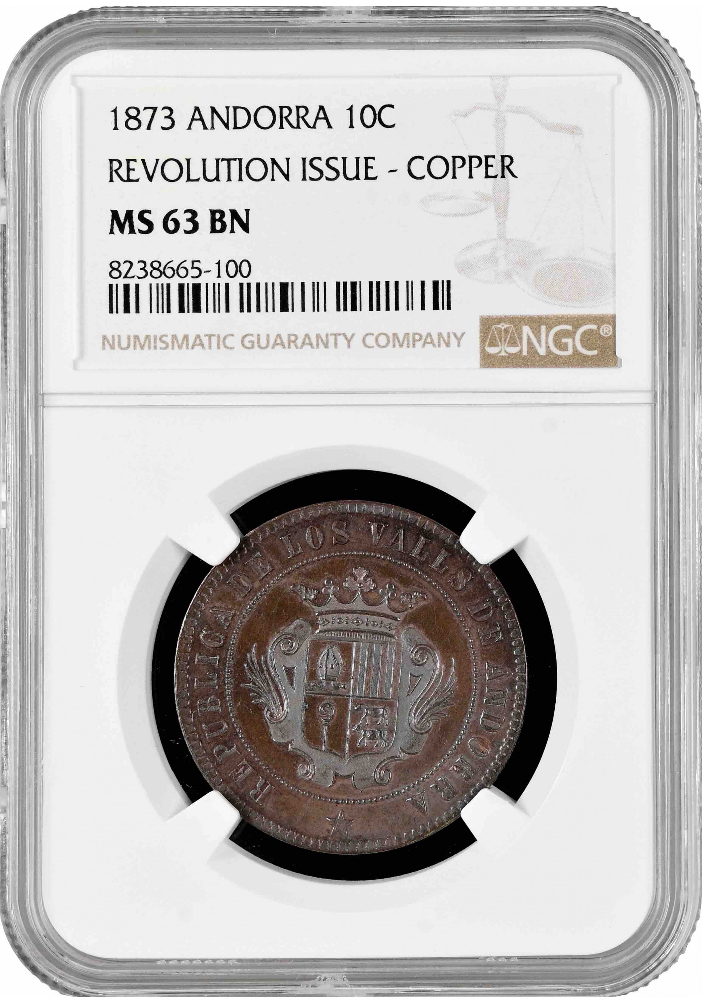 Андорра 10 сантимов 1873 г., NGC MS63 BN, "Революционный выпуск - Медь"