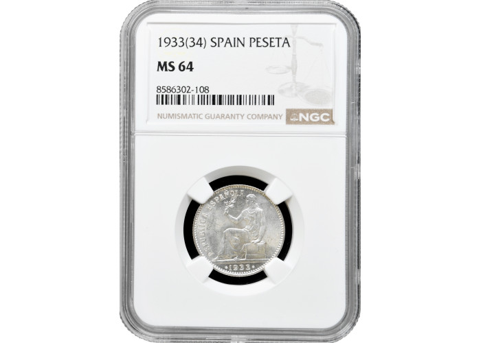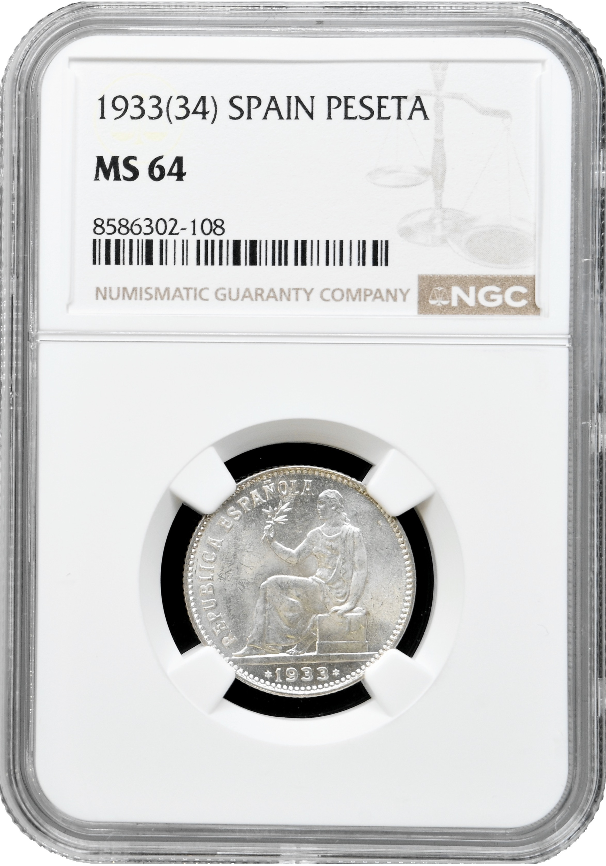 Испания 1 песета 1933 г. (34), NGC MS64, "Вторая Республика (1931 - 1939)"