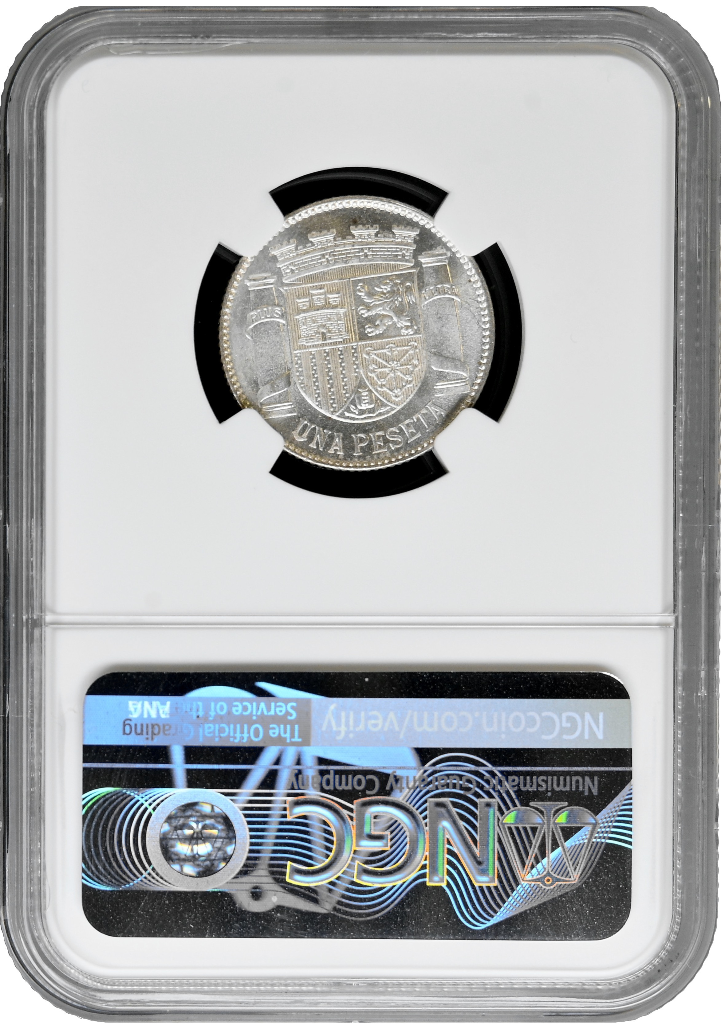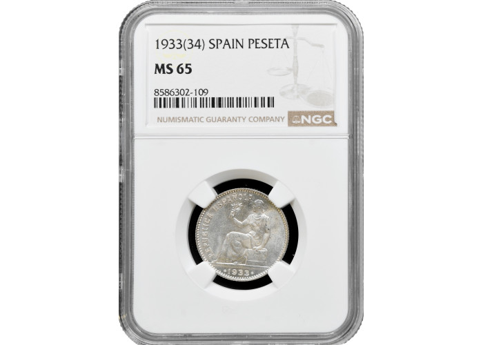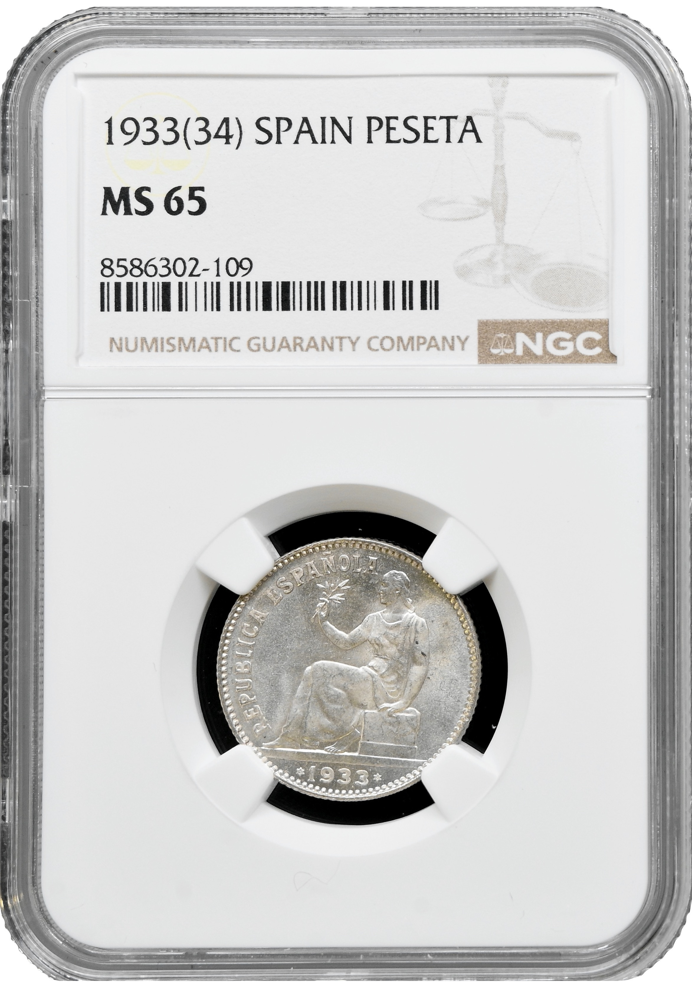 Испания 1 песета 1933 г. (34), NGC MS65, "Вторая Республика (1931 - 1939)"