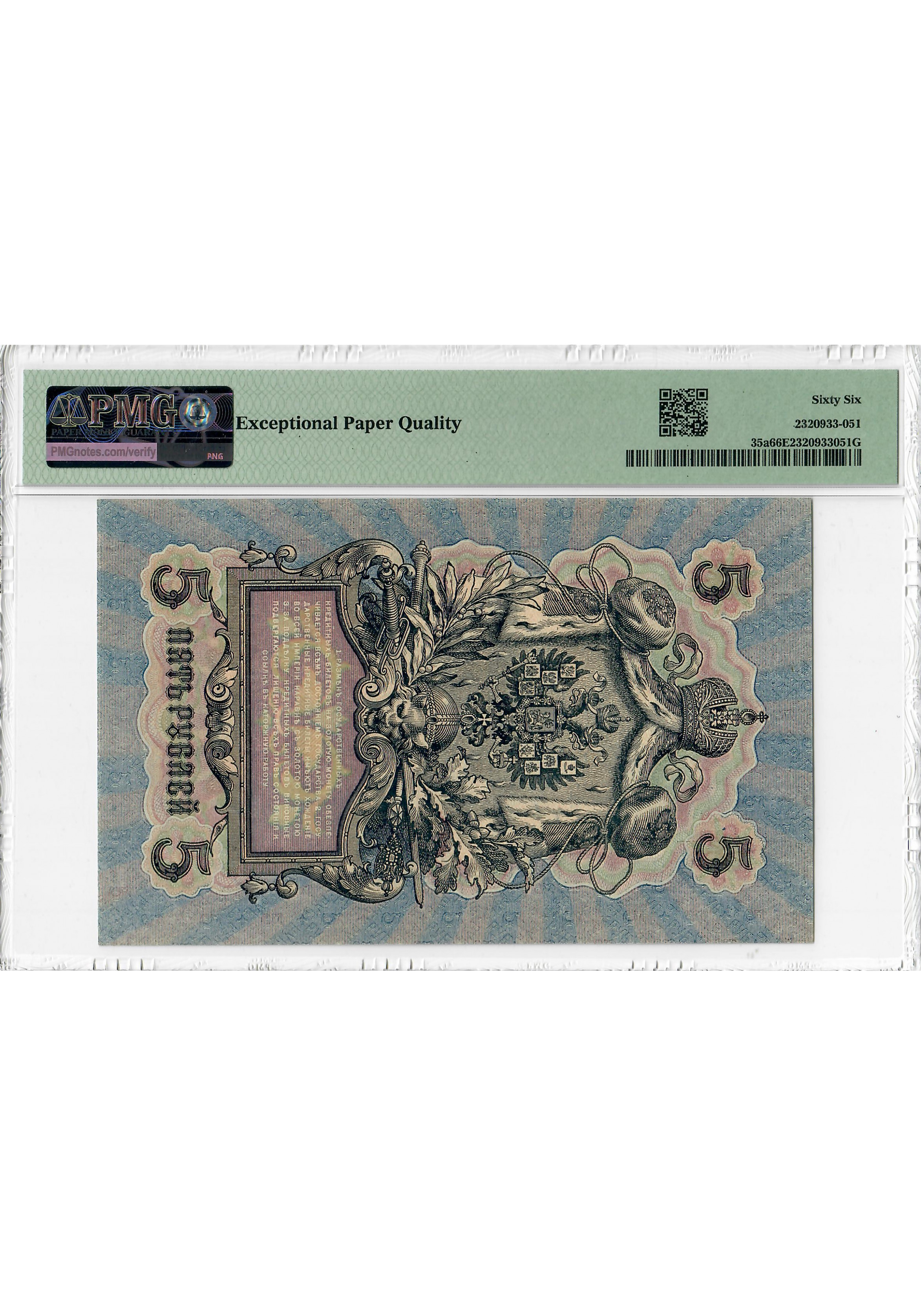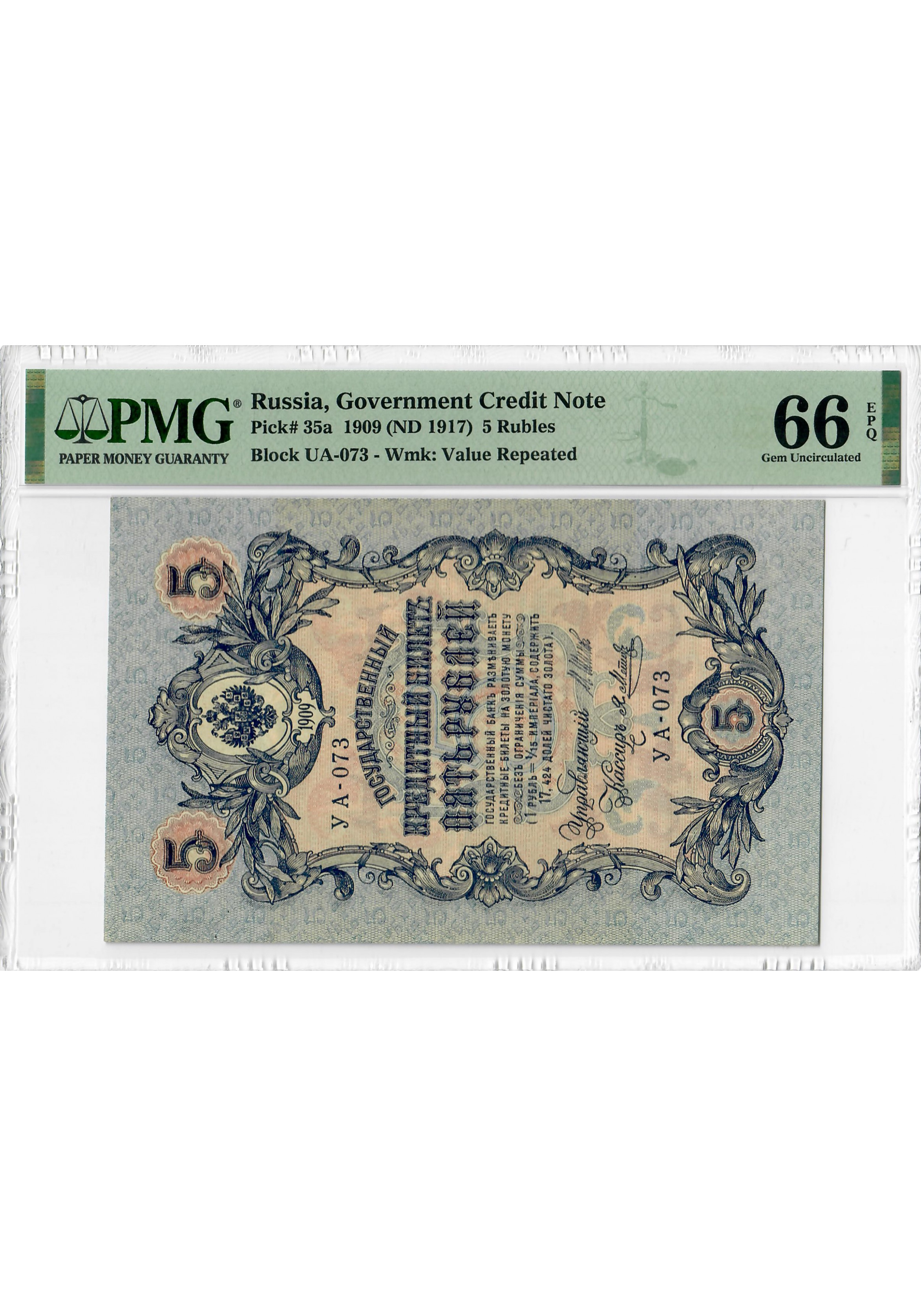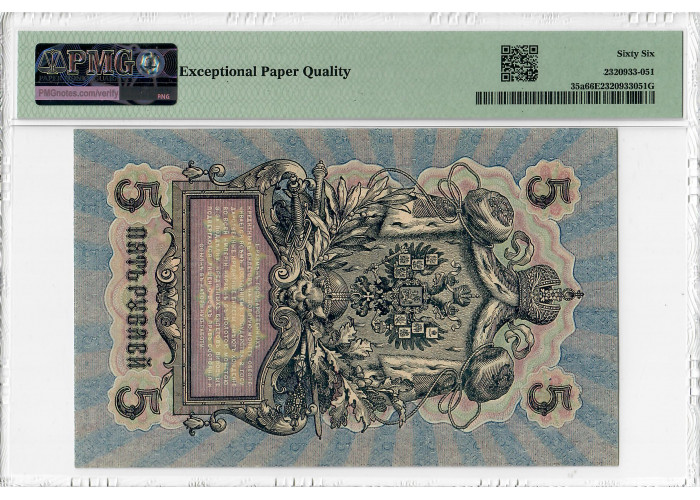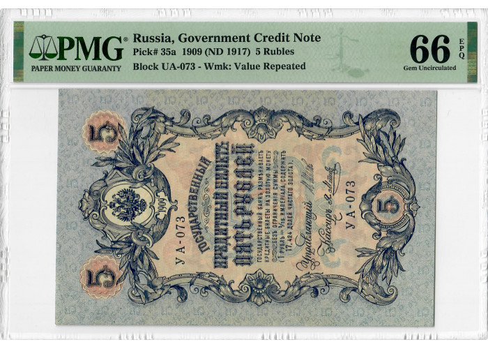 Росія 5 рублів 1909 (ND 1917), PMG 66 EPQ, "Урядова кредитна нота", Pick# 35a