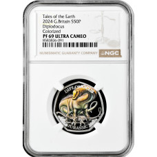 Великобритания 50 пенсов 2024 г., NGC PF69 UC, "Динозавры - Диплодок, Цветное покрытие"