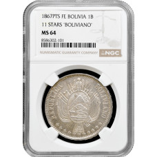 Боливия 1 боливиано 1867 г. PTS FE, NGC MS64, "Республика Боливия (1864 - 1869)" Top Pop 1/0