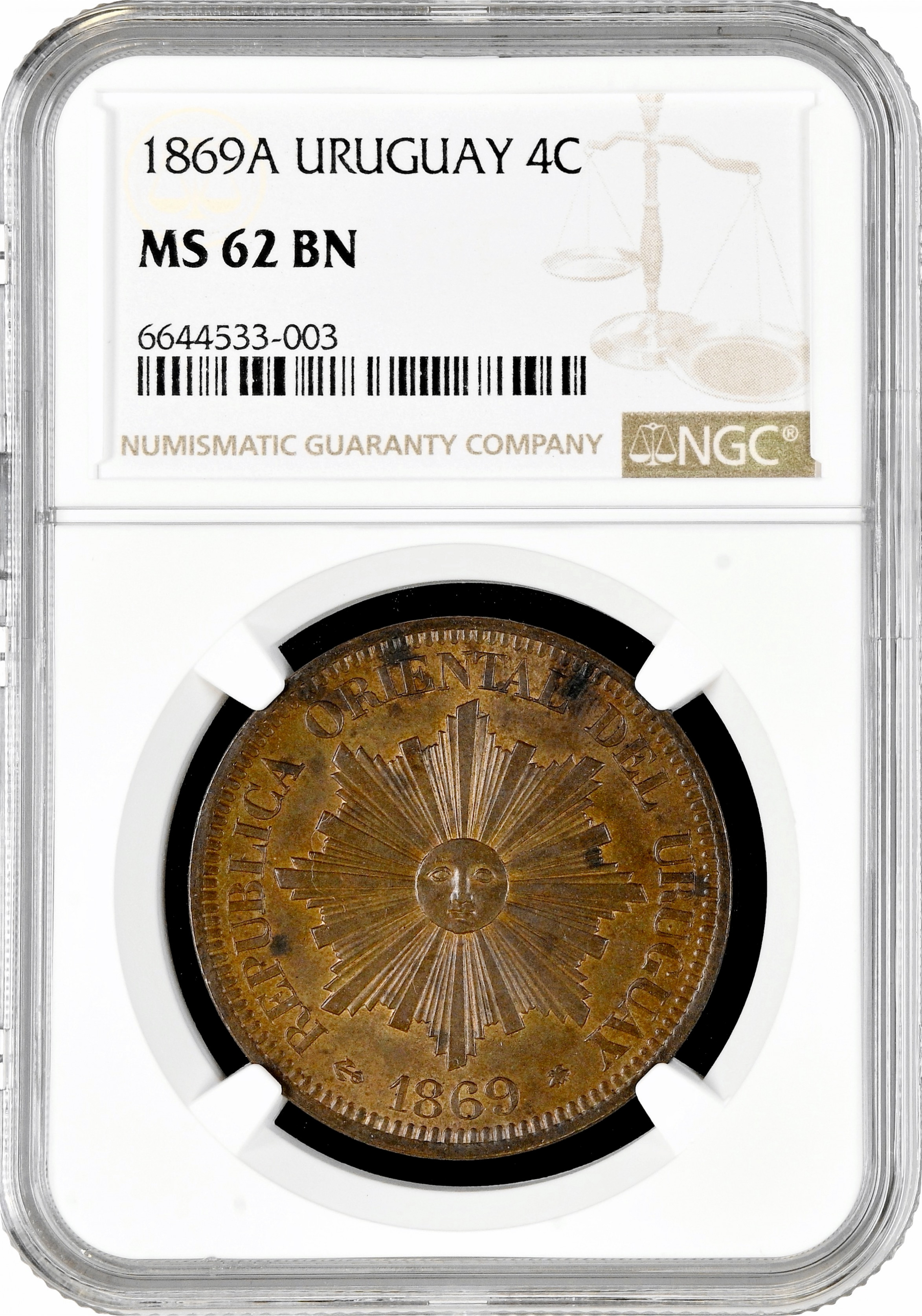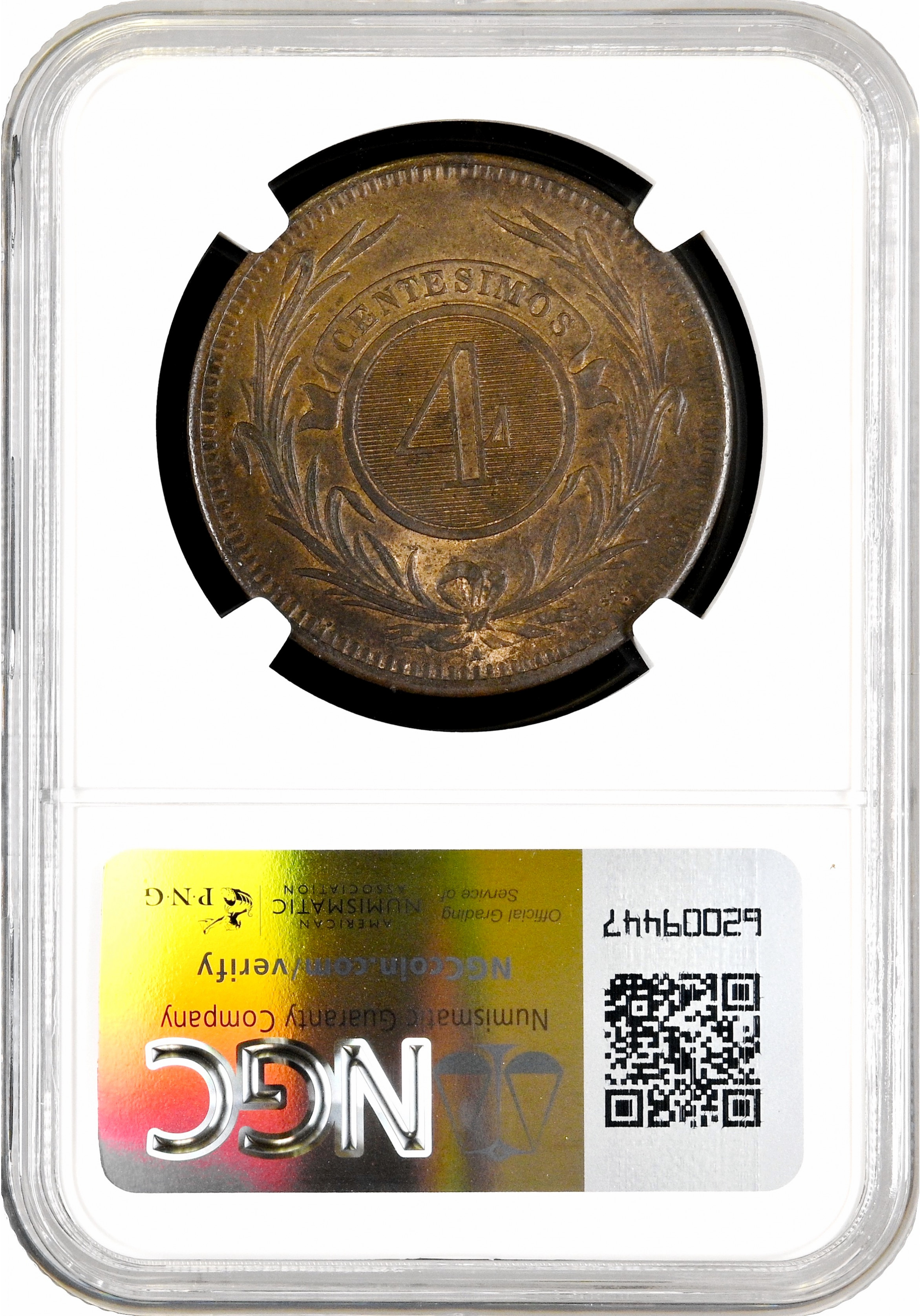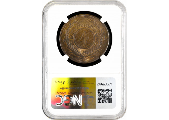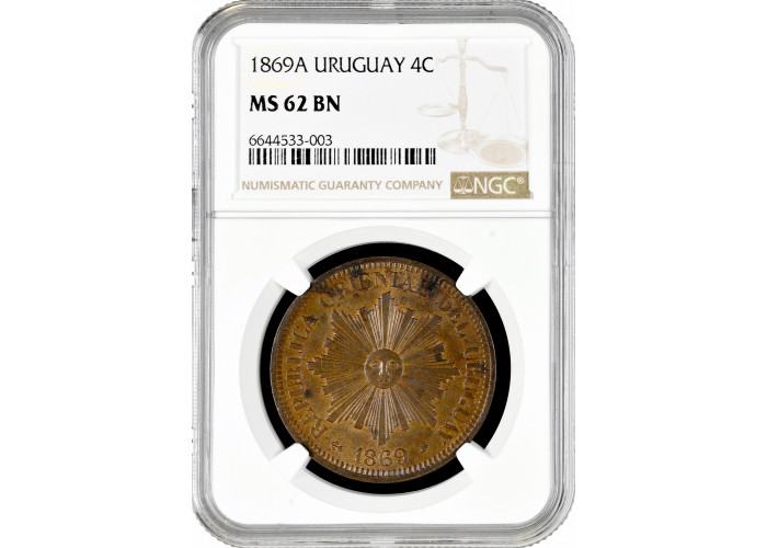Уругвай 4 сентесимо 1869 г. A, NGC MS62 BN, "Песо (1862 - 1974)"